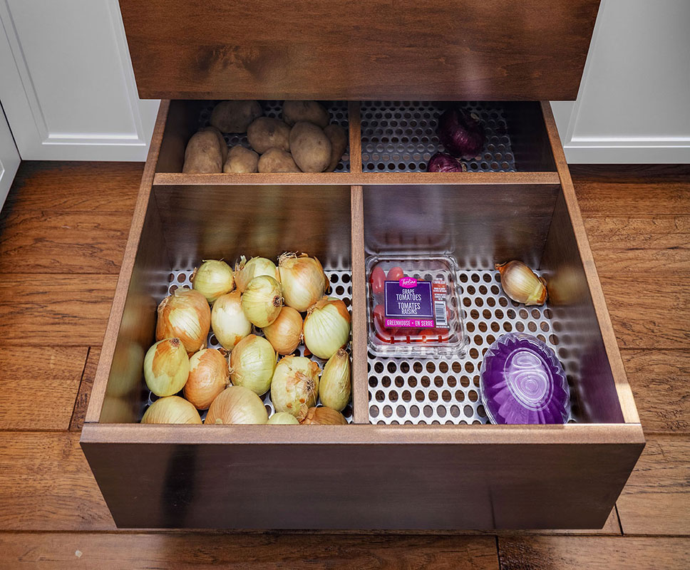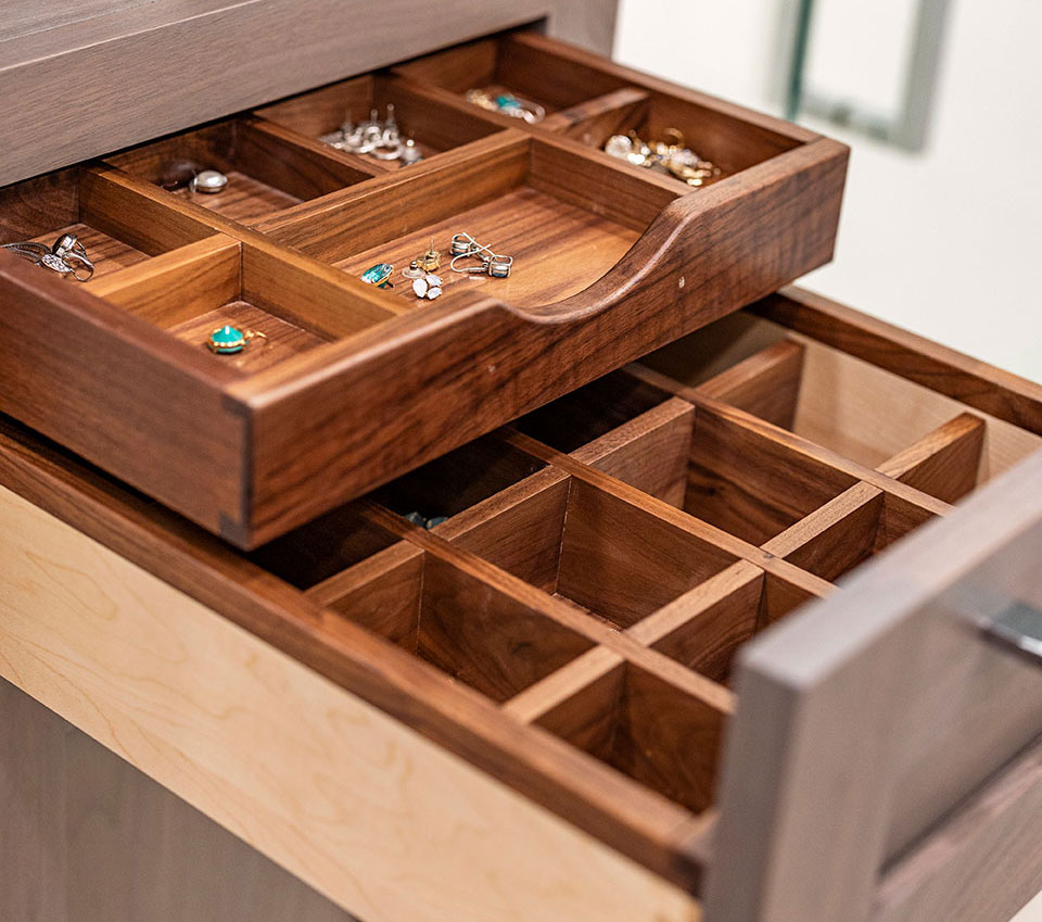 Bakes & Kropp Fine Cabinetry features doors and drawers that fit inside framed openings, flush with the surface of the frame. This type of construction requires an extra degree of craftsmanship and produces a full, sleek view of the frame, with only minimal spacing between the components.