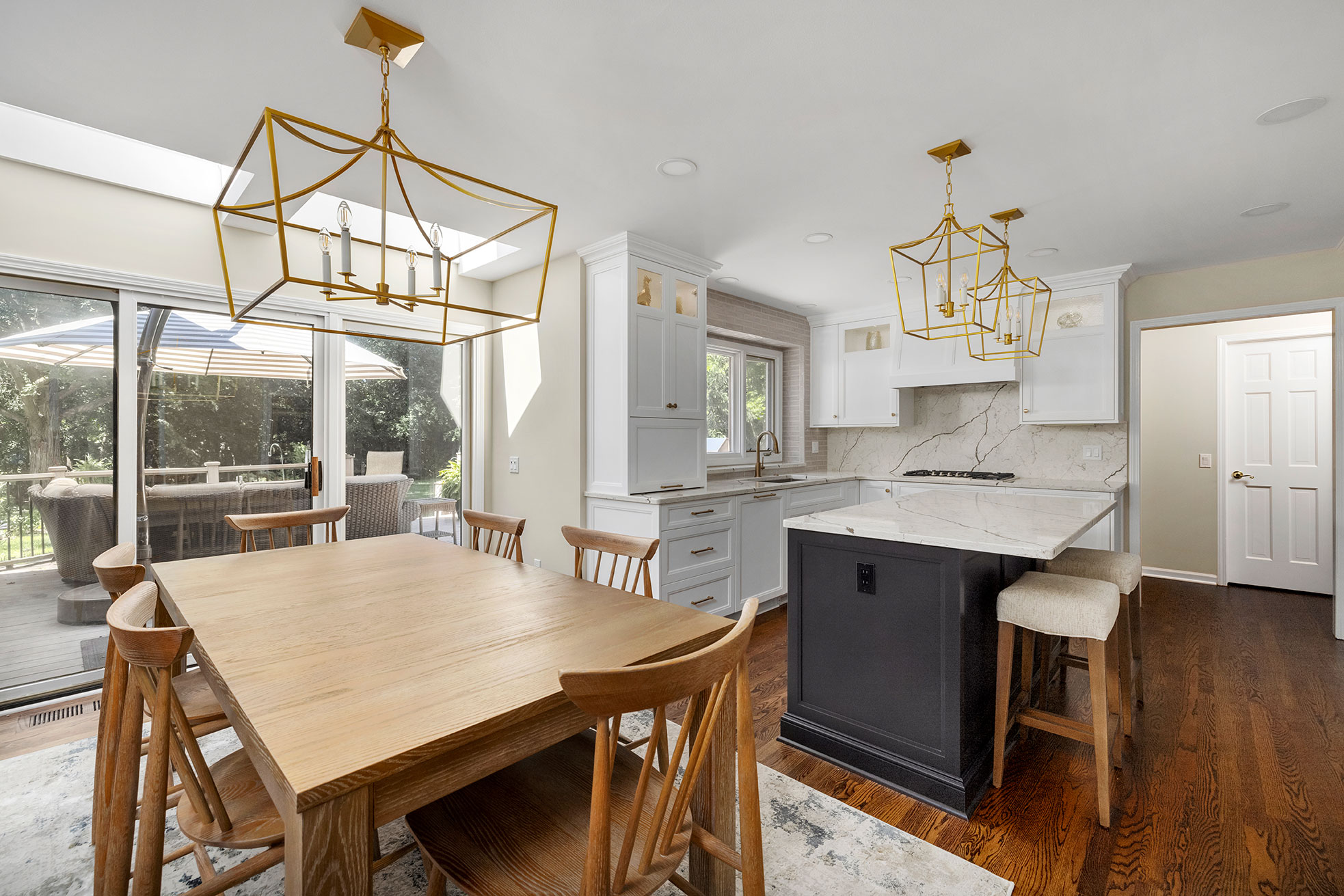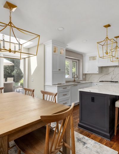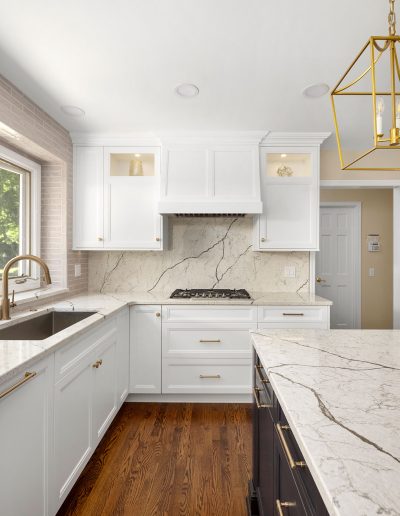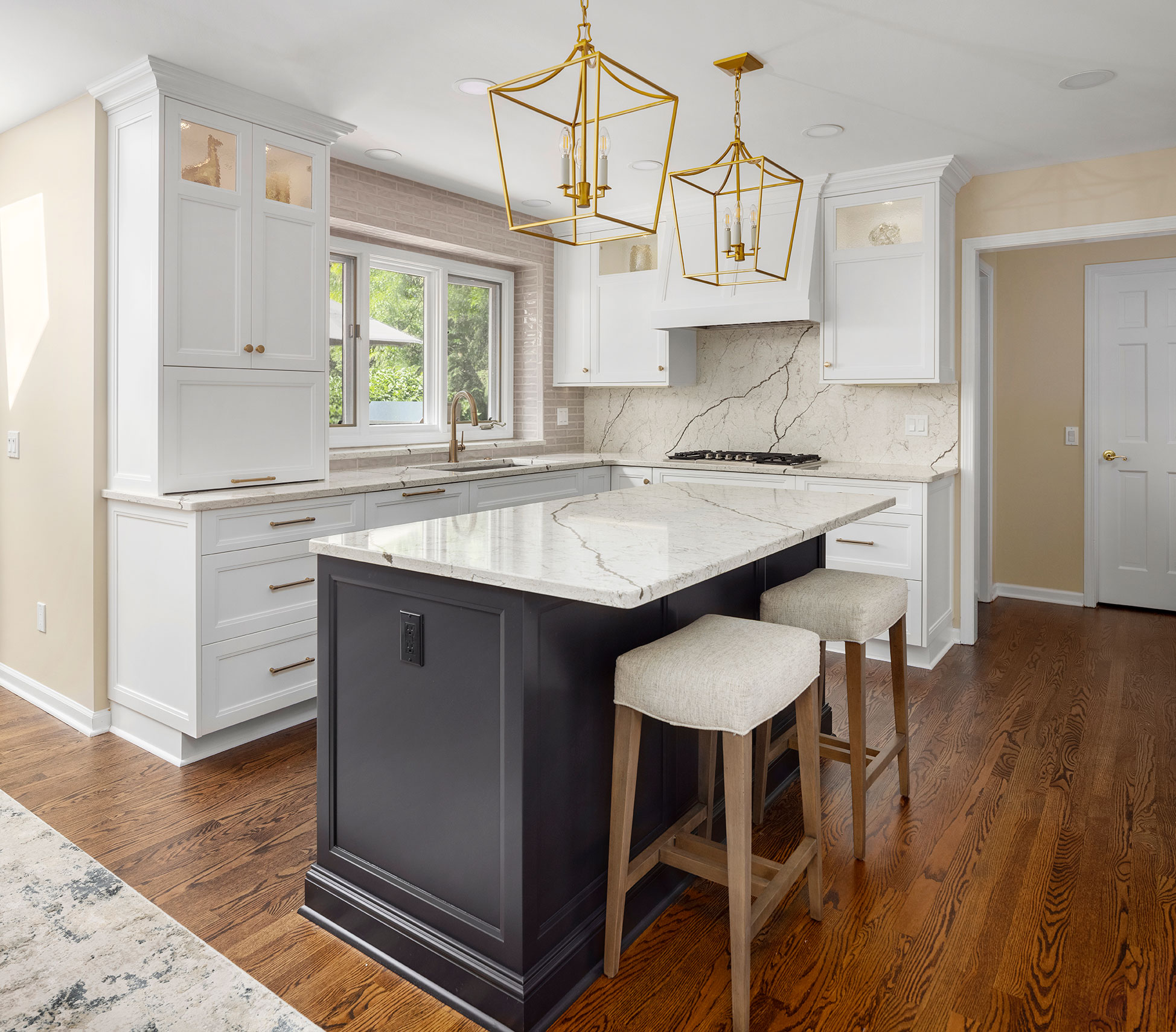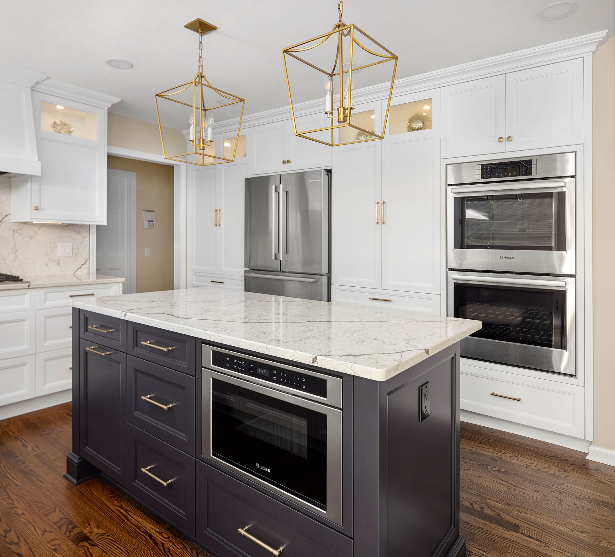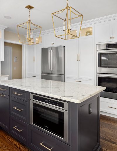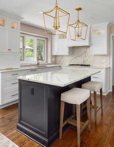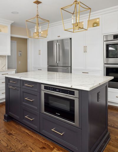 Nuances in Navy TRANSITIONAL Sharer Cabinetry painted in white is offset by a darker tone center island featuring our obsidian custom paint color. A stunning quartz countertop and backsplash add a touch of drama while brushed brass fixtures round out the lux look. Let's get started