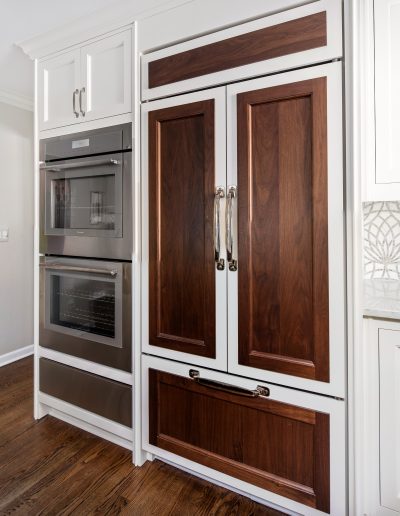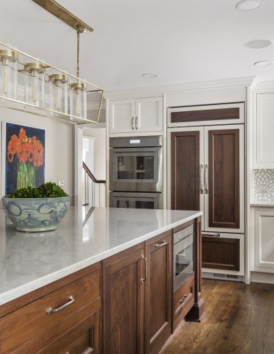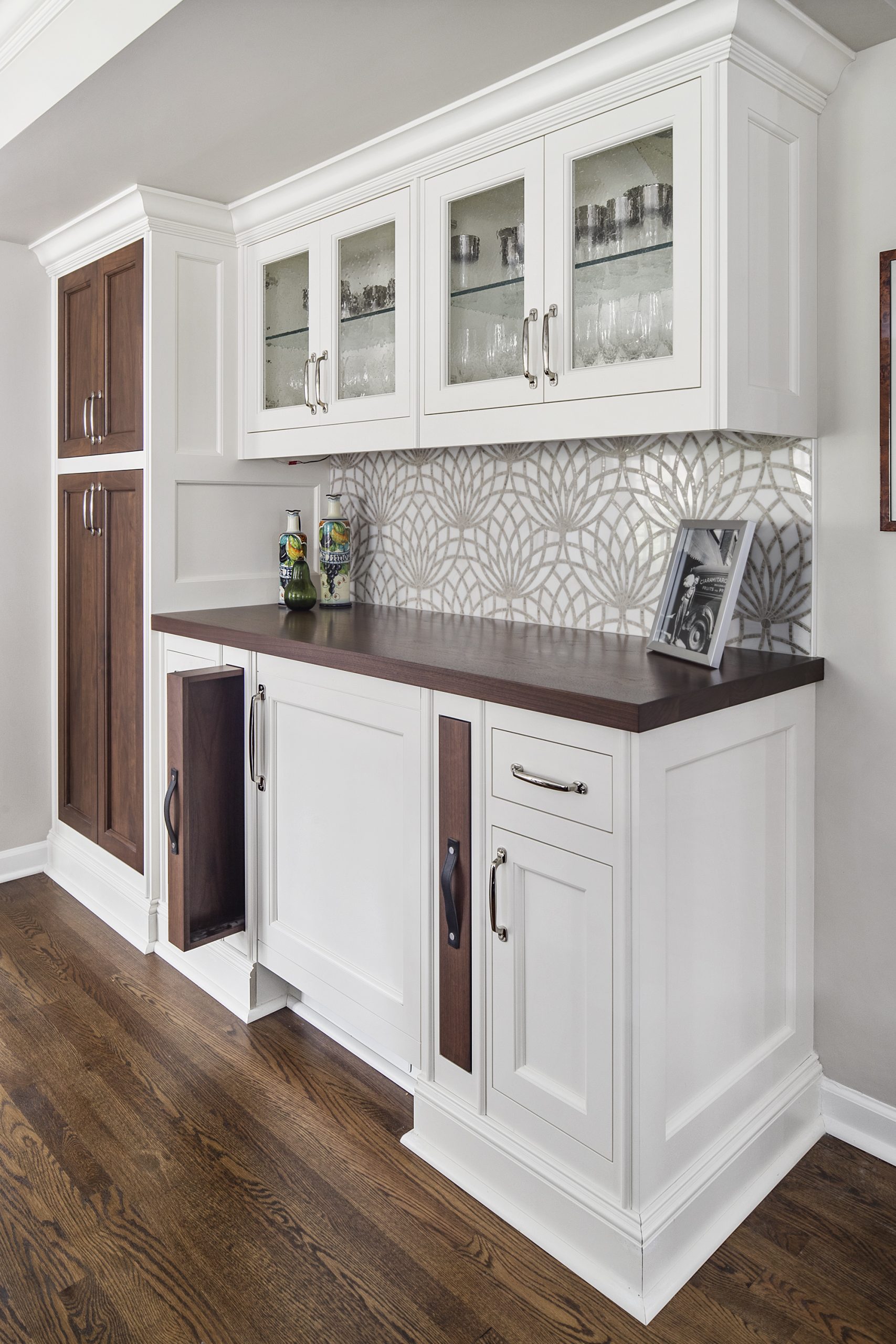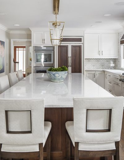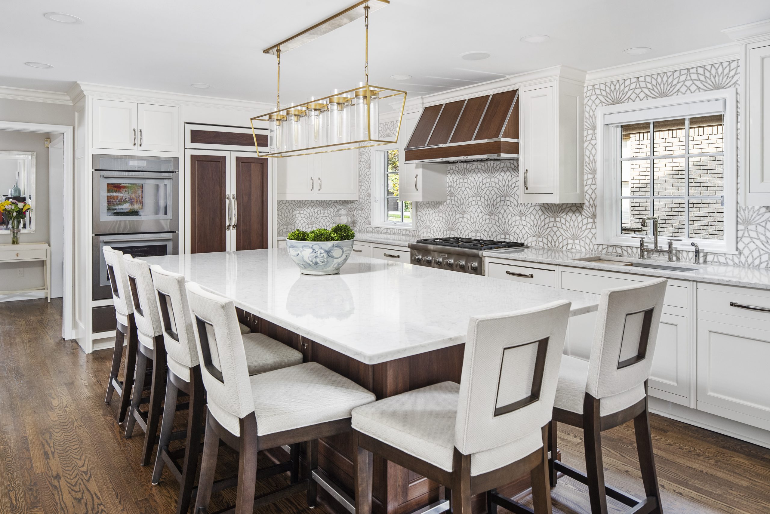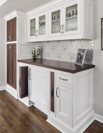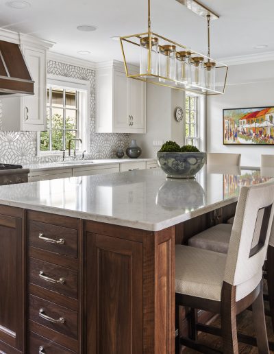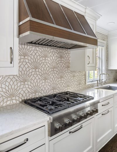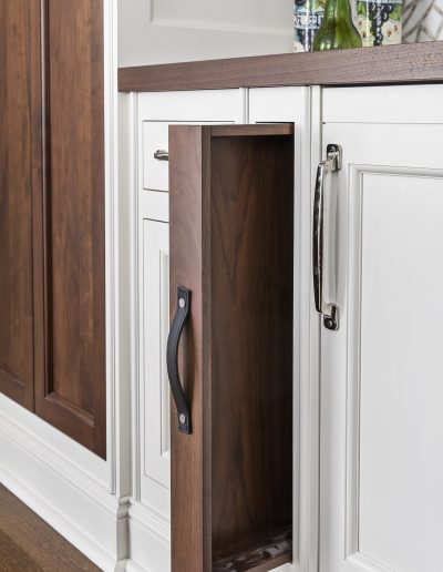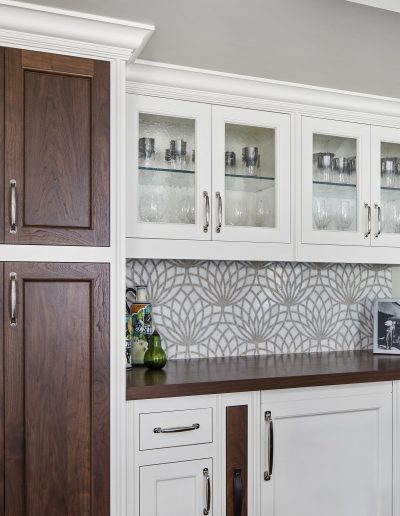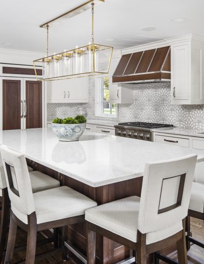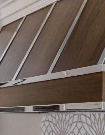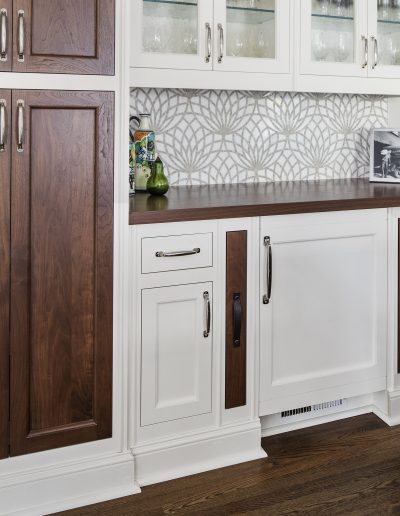 This kitchen is a stunning example of design and functionality. Details like a sophisticated backsplash and custom walnut hood give the room an upscale, posh feel. Luxury custom cabinets by Bakes & Kropp Fine Cabinetry offer ample storage and unique features, like pull-out serving trays for entertaining. This kitchen is beauty and function all in one!