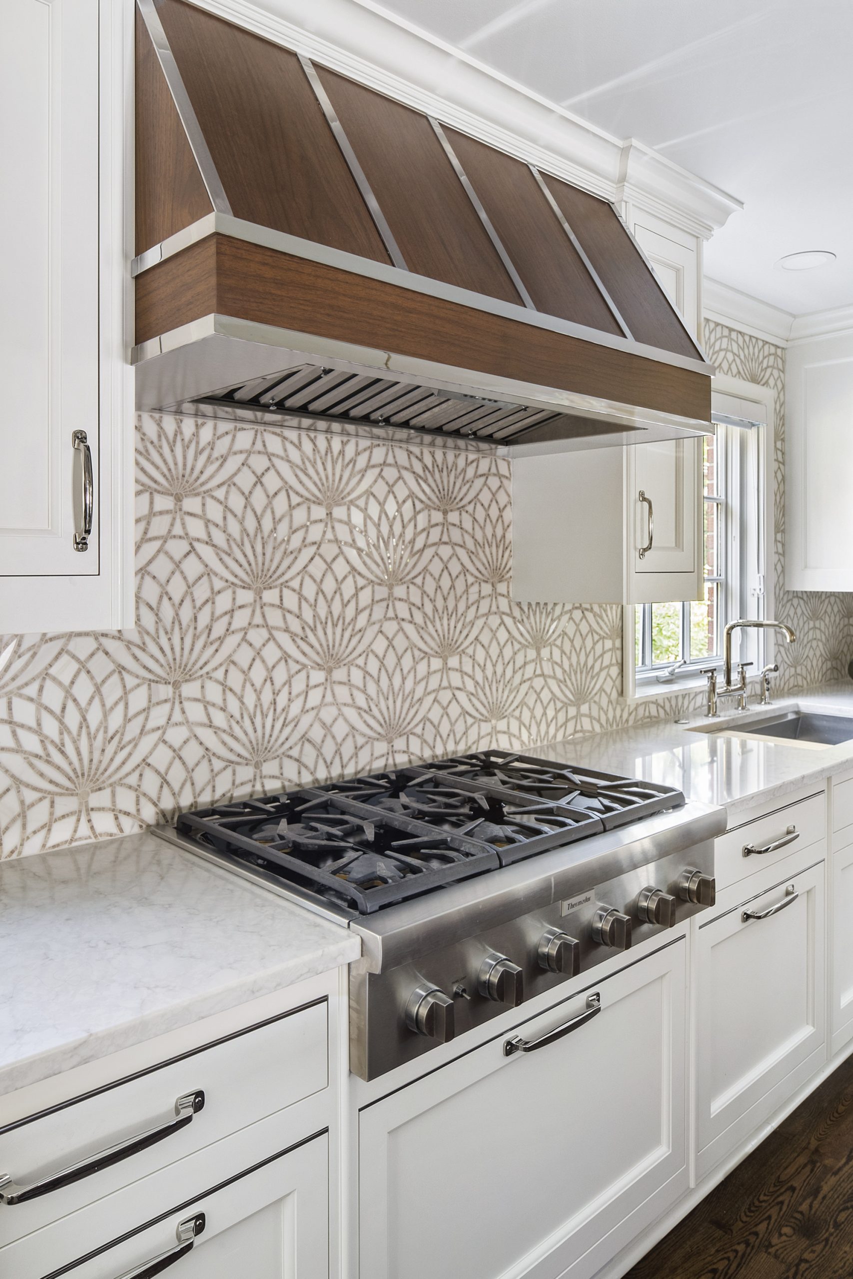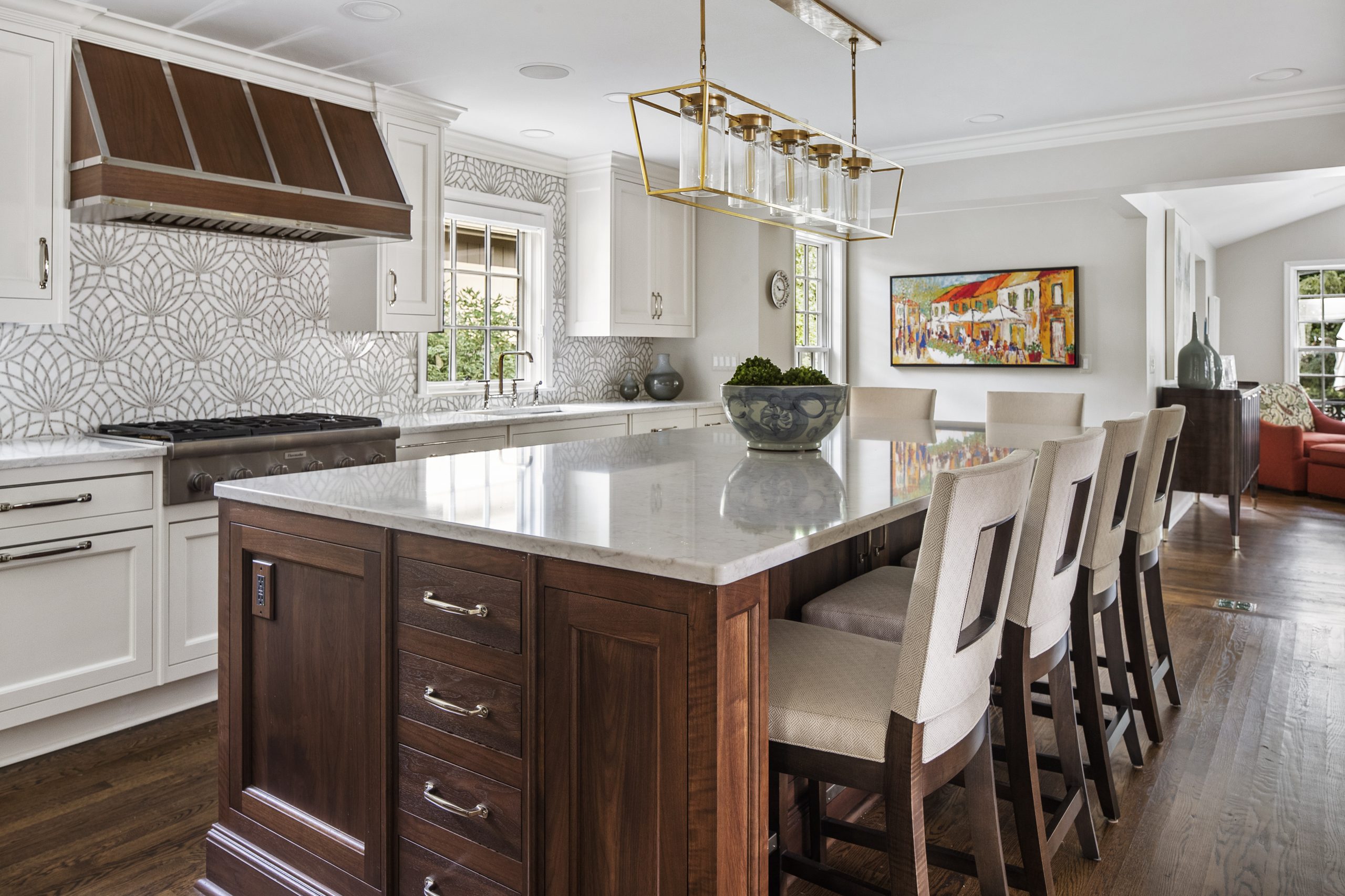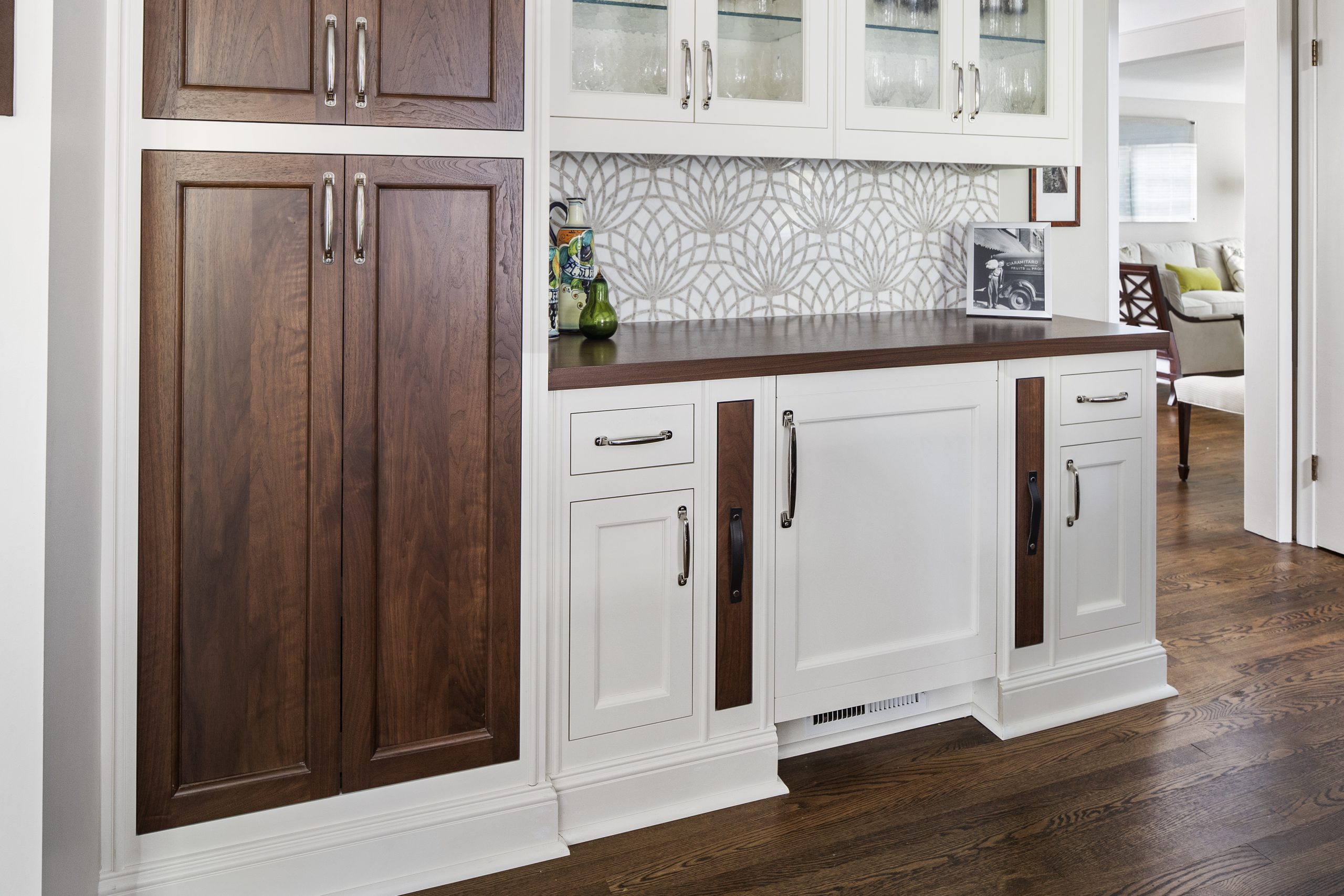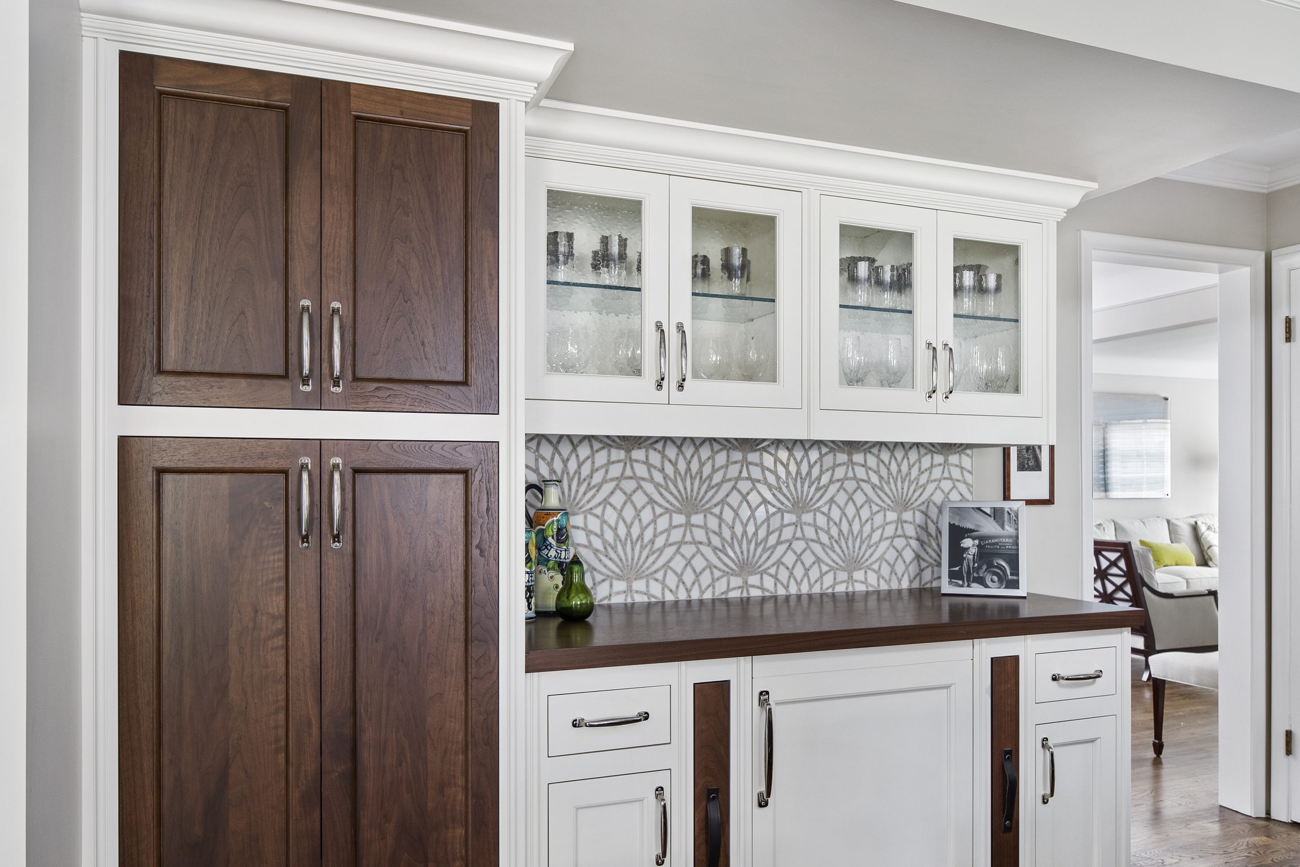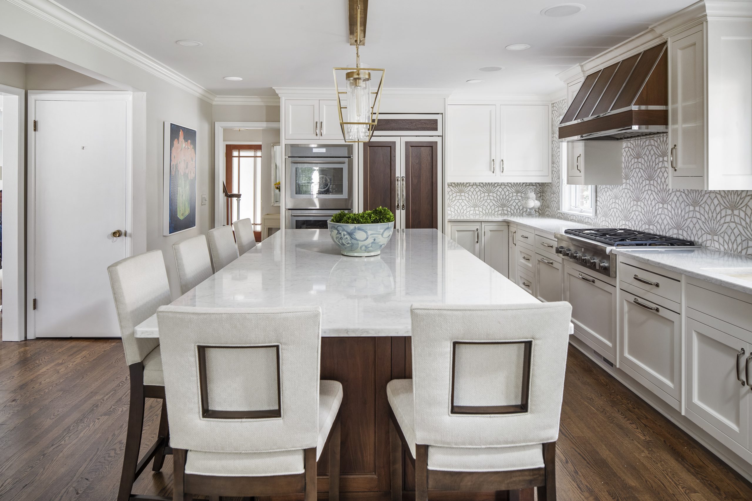 This kitchen is a stunning example of design and functionality. Details like a sophisticated backsplash and custom walnut hood give the room an upscale, posh feel. Luxury custom cabinets by Bakes & Kropp Fine Cabinetry offer ample storage and unique features, like pull-out serving trays for entertaining. This kitchen is beauty and function all in one!