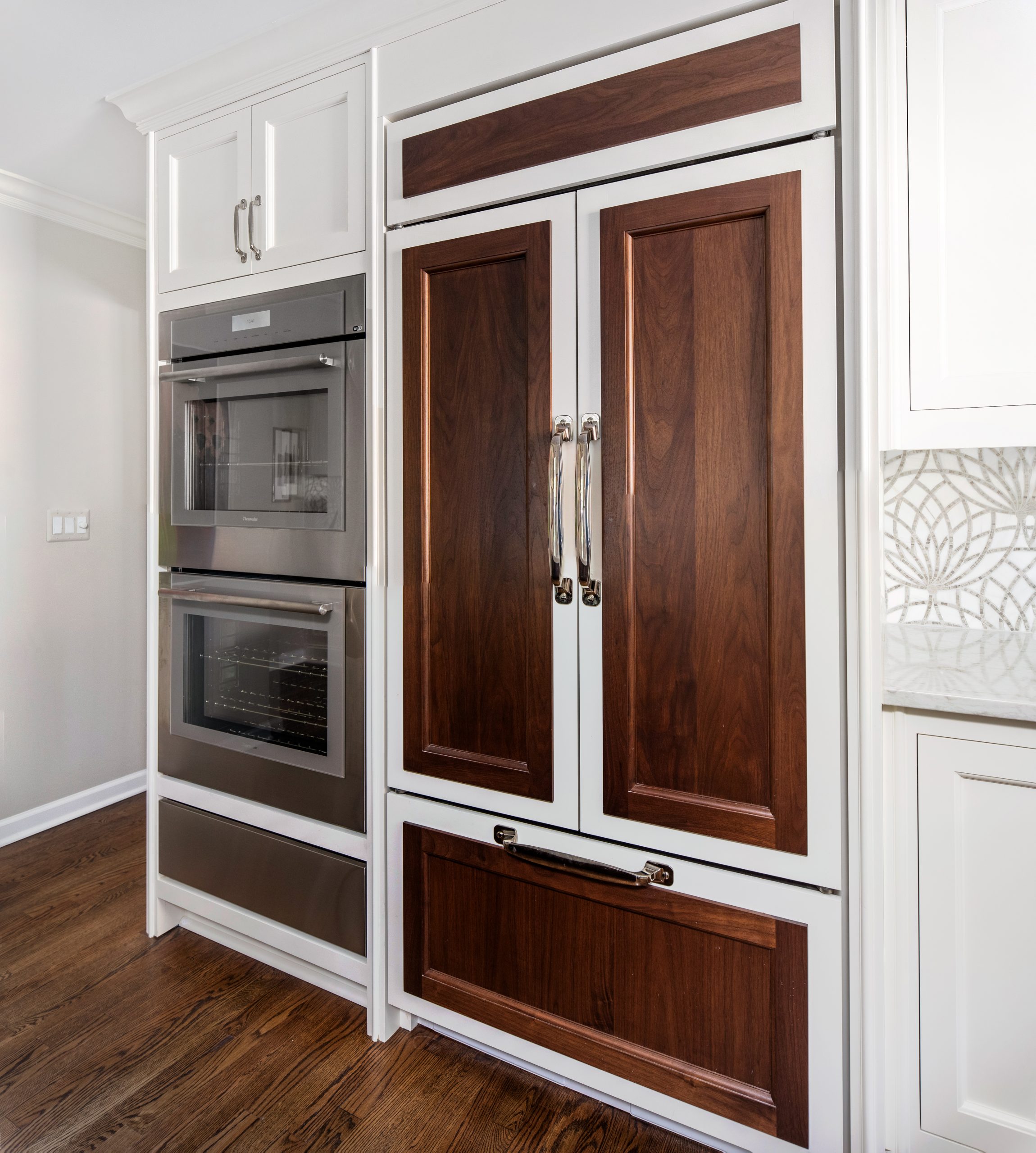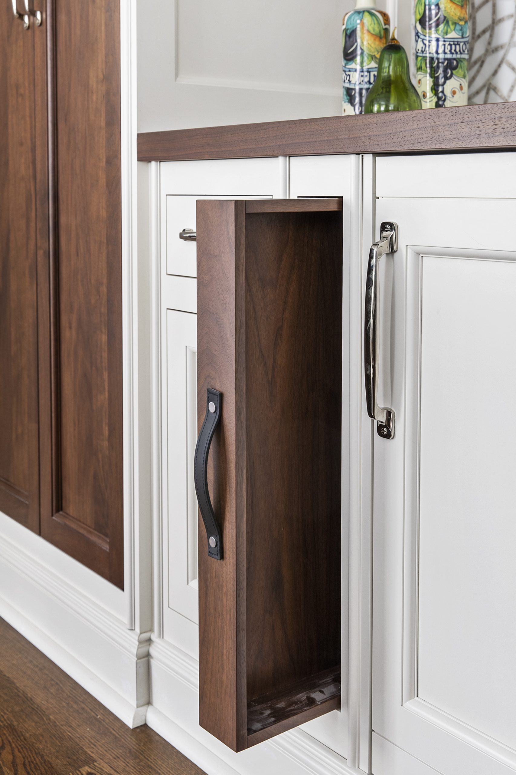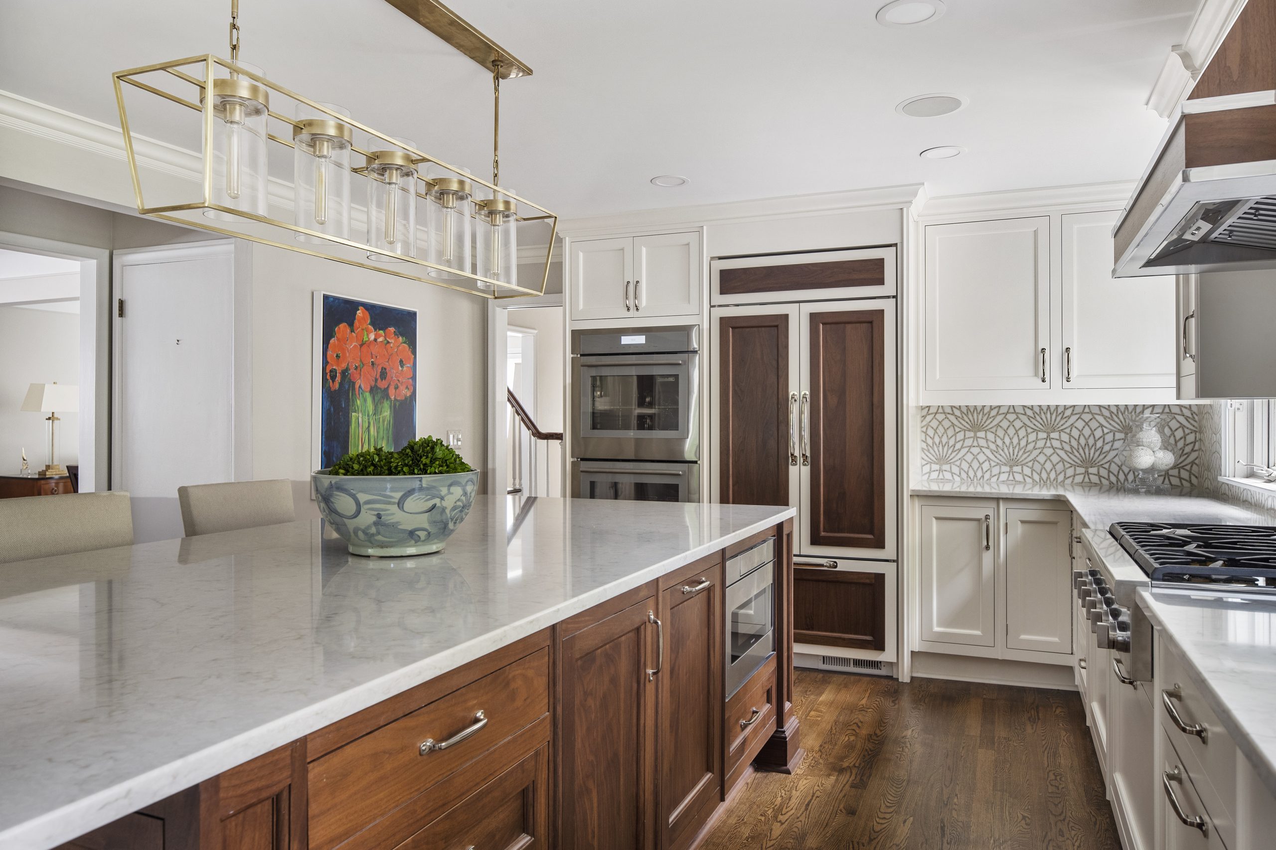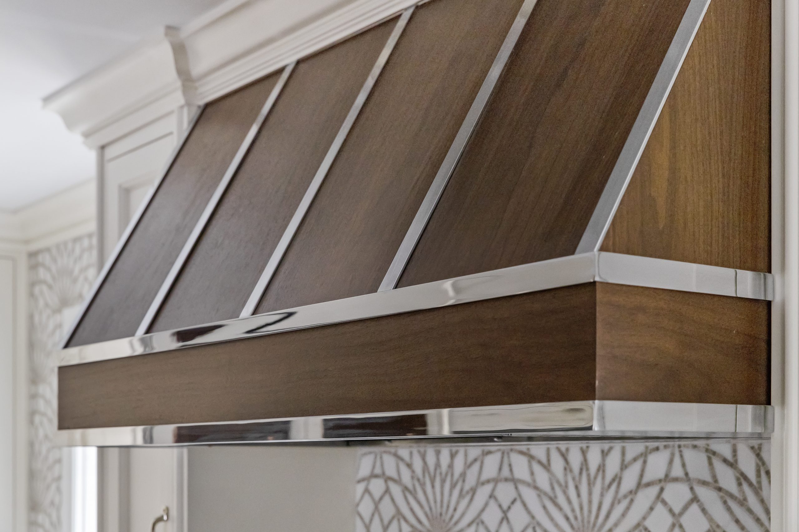 This kitchen is a stunning example of design and functionality. Details like a sophisticated backsplash and custom walnut hood give the room an upscale, posh feel. Luxury custom cabinets by Bakes & Kropp Fine Cabinetry offer ample storage and unique features, like pull-out serving trays for entertaining. This kitchen is beauty and function all in one!